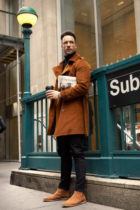 Ein Alleinstellungsmerkmal ist auf jeden Fall die Qualität und die Passform. Da haben wir, gerade bei der Lederjacke, sehr lange dran gebastelt. Eine Messlatte haben wir uns in dieser Hinsicht selber gesetzt. Die Produkte wollte ich so haben, wie ich sie auch selber anziehen würde. Da kam es zu ein paar Extrarunden in der Produktion. Ein anderes Beispiel ist der Navy Coat, bei dem wir gesagt haben, dass er tailliert sein muss, aber die Schultern nicht zu breit geraten dürfen. Außerdem ist dort Kaschmir mit drin, damit er sich noch besser auf der Haut anfühlt.