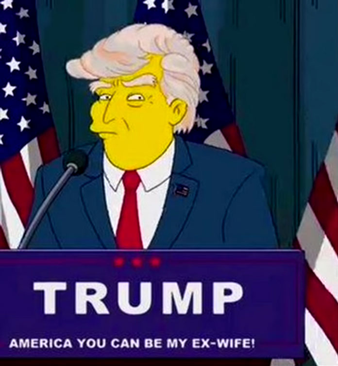 Wenn es nicht so traurig wäre, dann wäre es fast schon lustig. Der Wahlspruch, „America you can be my Ex-Wife” ist zwar leider nicht zum Einsatz gekommen, dennoch gab es bis zum Schluss immer noch Leute, die zurecht dachten, dass Trump keinen Ernst macht, sondern seine angebliche Spaßkampagne auflöst. Leider ist es nie dazu gekommen. Die Simpsons haben in einer der neueren Episoden zu Beginn der Folge einen Tafelgag gebracht, der auf diese Vorhersage anspielt. Bart schreibt im Vorspann beim Nachsitzen nämlich „being right sucks“ an die Tafel.